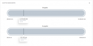 Mit dem Widget „Adaptive Messwerte“ können Sie einen Sensorwert (z.B. analoger Messwert: 4-20mA) skalieren und in eine beliebige Maßeinheit umrechnen. Geben Sie hierzu zunächst eine Start– und Endpunkt inkl. Einheit der Eingabe in der ersten Zeile an. Anschließend wählen Sie den Wertebereich der Ausgabe, indem Sie auch hier Start– und Endpunkt definieren.