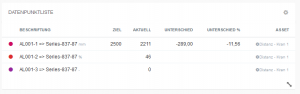 Das Widget “Datenpunktliste” zeigt Datenpunkte (Messwerte) in einer Liste, einen pro Zeile, mit aktuellen Werten und Datenpunktattributen. Wählen Sie eine verfügbare Datenreihe unter dem Menüpunkt „Datenpunkte“. Sie können durch einen Klick auf das Dropdown-Menü jeder Datenreihe Ziel-, Minimal- und Maximalwerte sowie die Maßeinheit zuweisen. Diese Werte dienen als Berechnungsgrundlage für die Differenzen (s.u.).