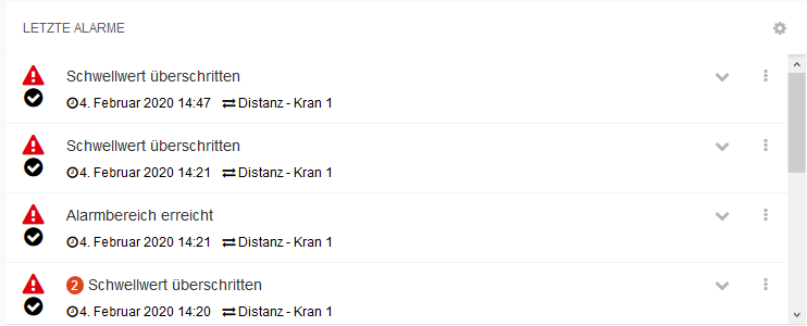 Das Widget “Letzte Alarme” zeigt die zuletzt anliegenden Alarme über alle Sensoren von allen io-keys. Es können keinen zusätzlichen Parameter konfiguriert werden.