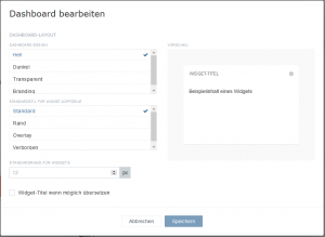 - In the “Dashboard layout” section you can select a design for the dashboard (“Bright”, “Dark”, “Transparent” or “Branding”) and a standard style for the header of the widget (“Standard”, “Border”, “Overlay” or “Hidden”). You can also define the setting for the border of the widget (default value is 12 px). A preview of the selected layout settings is displayed immediately on the right to visualise your settings