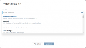 - A window in which you can select a large variety of widgets by drop-down menu opens. Select a widget type from the selection list. Additional fields for editing are displayed depending on the selected type. Details for all widget types