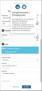 - Select whether the rule shall be triggered when the comparative value is exceeded or fallen below and specify a comparative value in the value range of the sensor. The unit of the measured value is added automatically