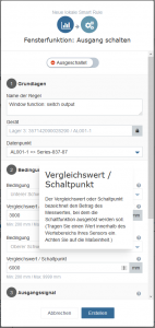 The window function refers to an extension of the io-key edge alarm and switching function. Here is it possible to define rules which execute an action in a defined value range only. It is specified by a defined starting and end point.